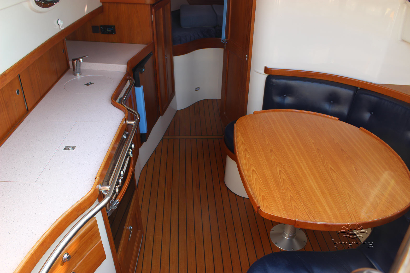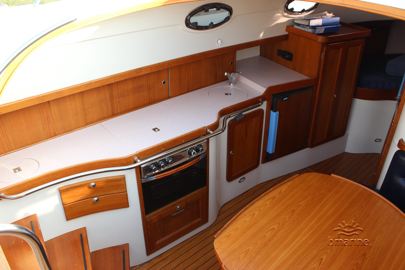 | Interieur | : | De cabin beschikt over een ruime rondzit welke tevens gebuikt kan worden als extra slaapplaats voor 2 personen, een afgesloten toiletruimte voorzien van een handdouche, keukenblok met een 4 pits kookstoestel, oven, koelkast en spoelbak met warm en koud water. In de boeg bevindt zich een vaste slaapplaats voor 2 personen. |