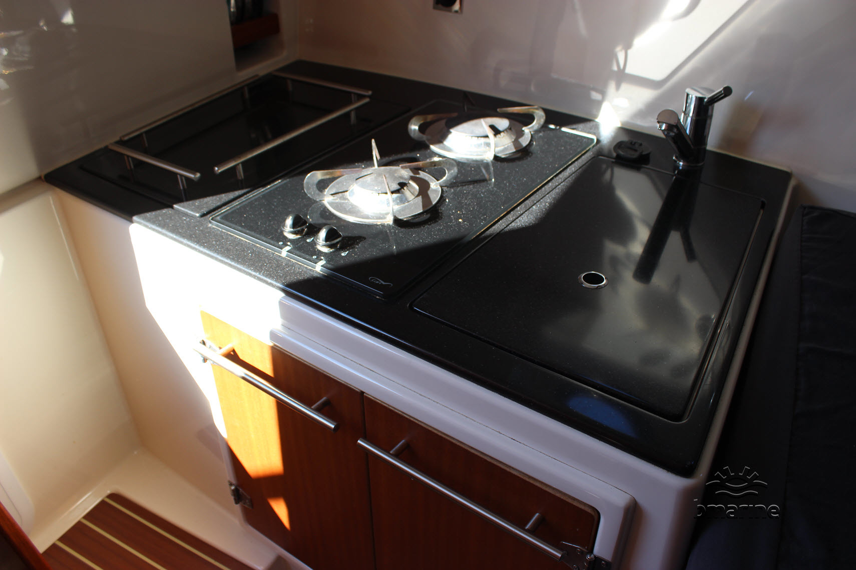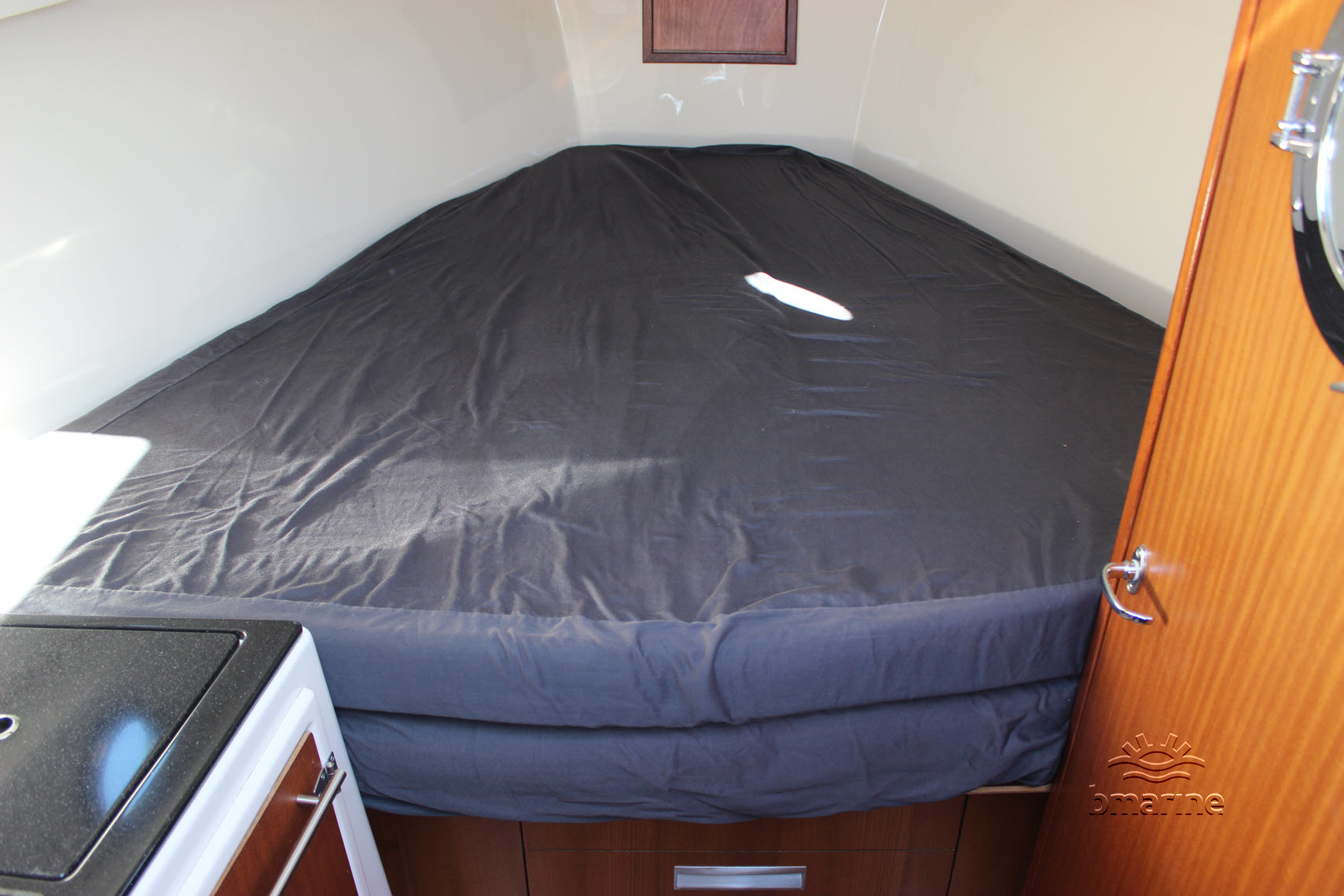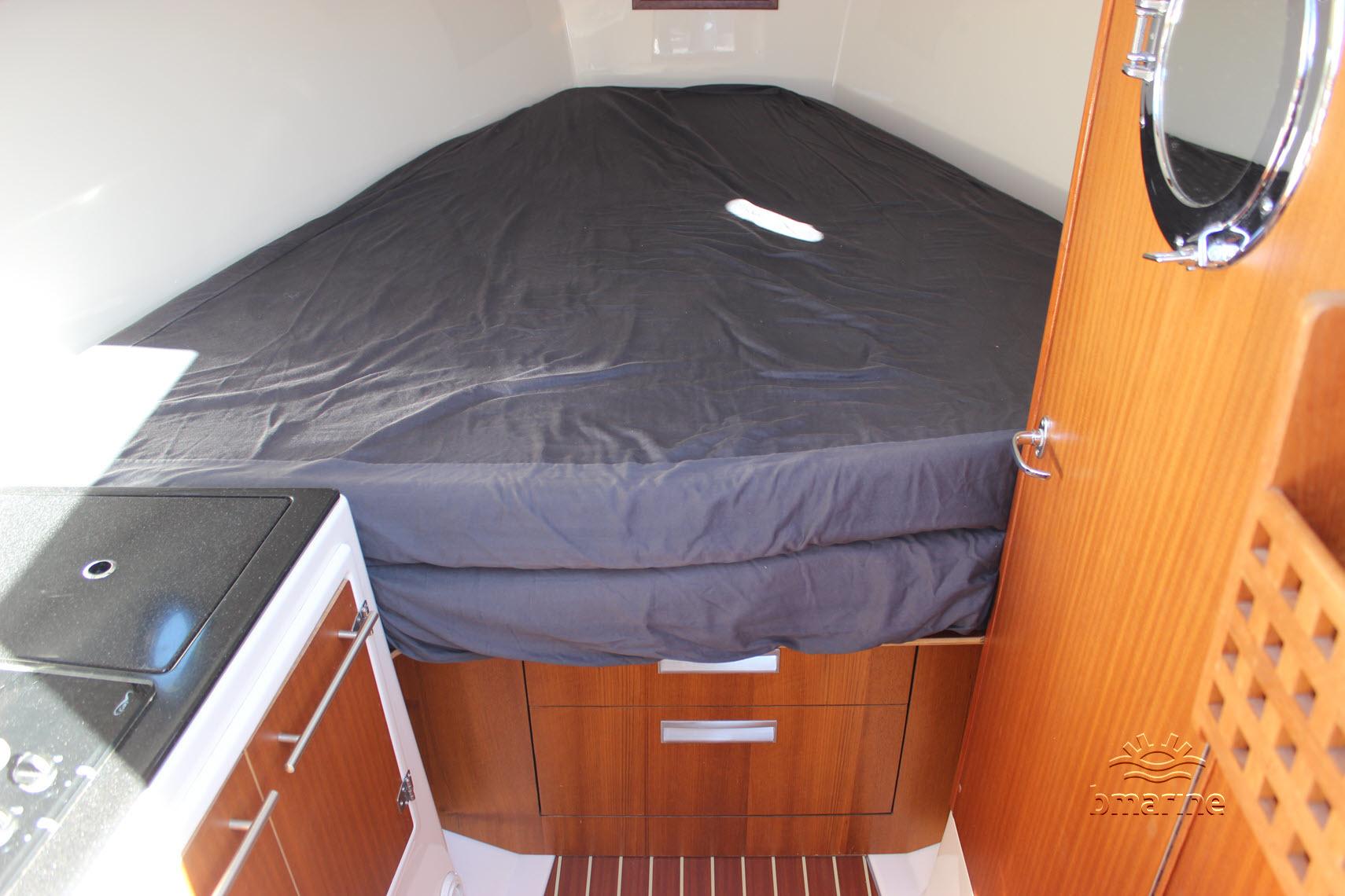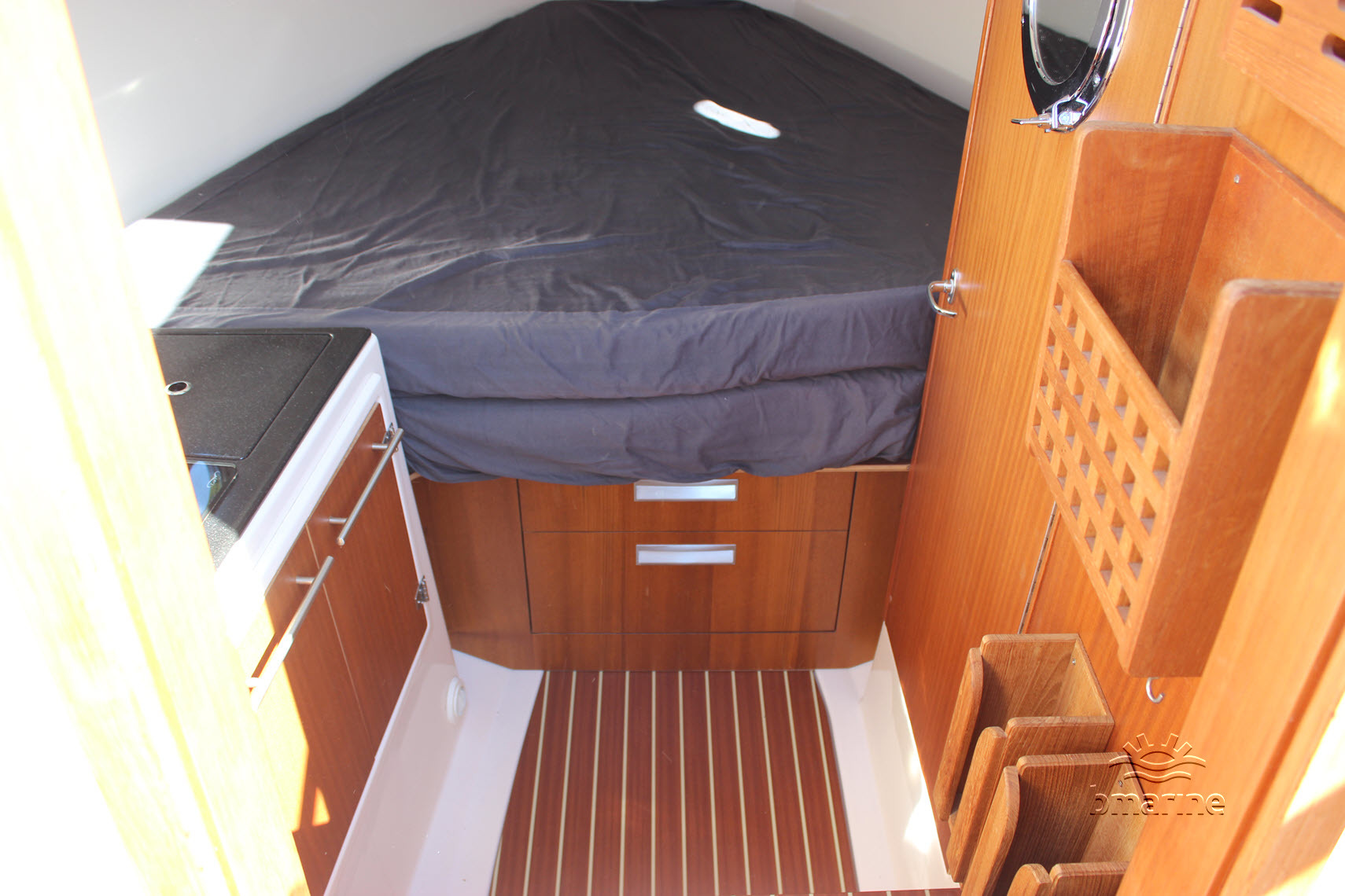 | Interieur | : | De ruime kuip is voorzien van een royale rondzit, met een Esthec-vloer en comfortabele stuur- en bijvaardersstoelen. De cabin beschikt over een vast bed voor 2 personen. Daarnaast is er een keukenblok aanwezig met stromend water, een tweepits gaskooktoestel en een koelkist. Verder is er een afgesloten toiletruimte met een elektrisch toilet en een handdouche. Zowel de kuip als de cabin kunnen worden verwarmd door middel van een Webasto heteluchtverwarming. |